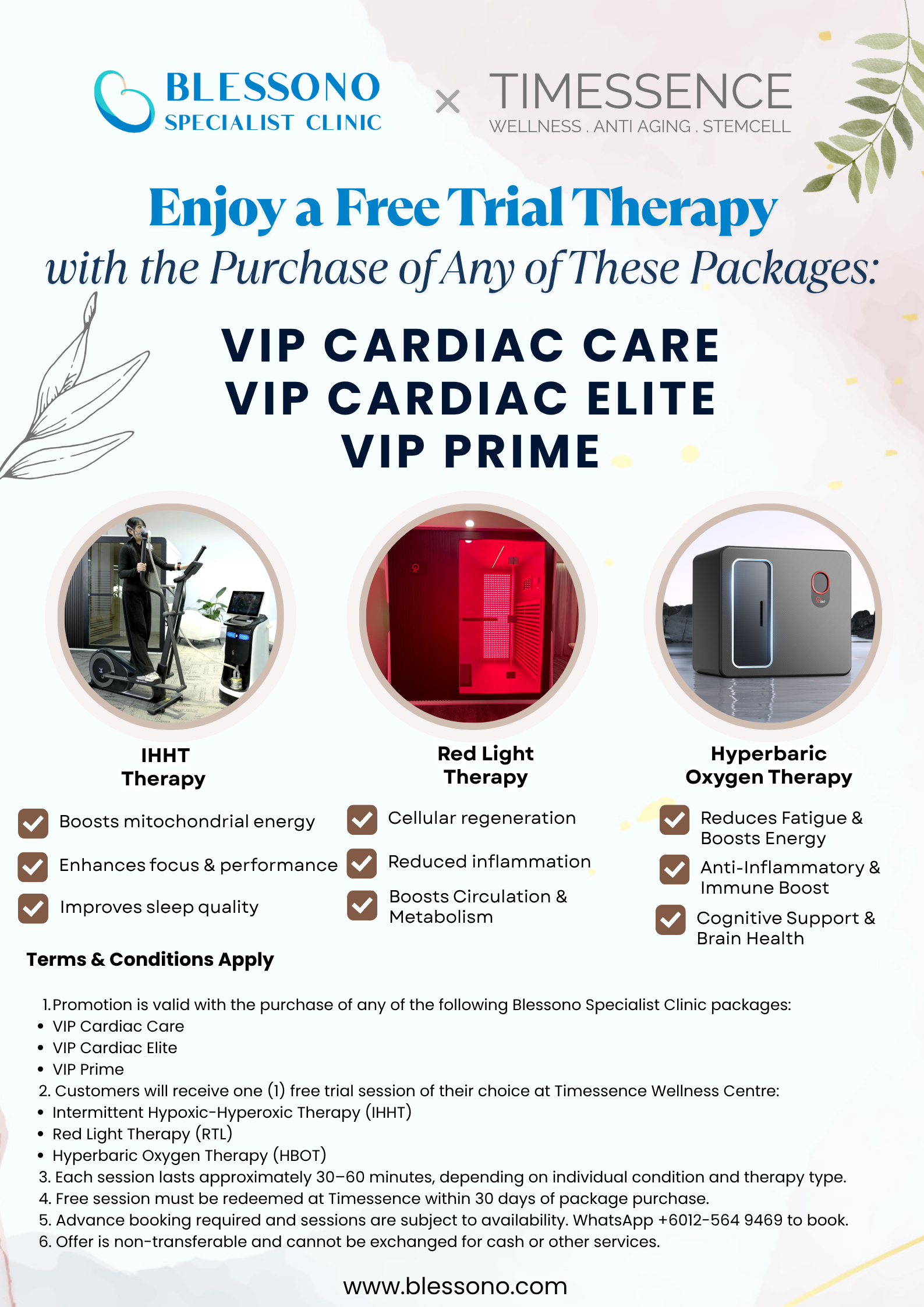 In collaboration with Timessence Wellness, Blessono Specialist Clinic is offering a complimentary trial therapy session with the purchase of any of the following packages: